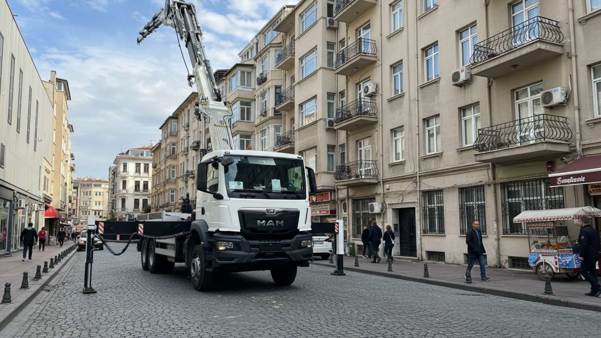 Kırmalı Sepetli Vinç: Engel aşma kabiliyeti sayesinde, binaların arka cephelerine veya yamaçlarda kalan kör noktalara yaya yolunu işgal etmeden erişim sağlar.